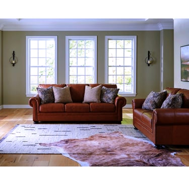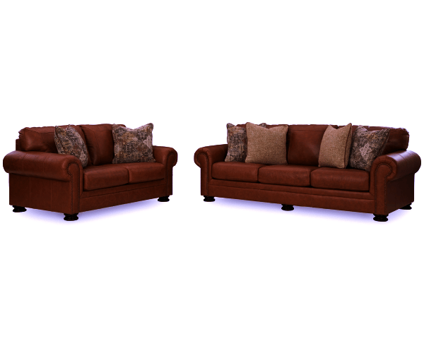 Discover the Carianna Sofa and Loveseat - a luxurious leather-match living room set with rolled arms, nailhead trim, plush cushions, and elegant transitional styling for comfort and timeless appeal.